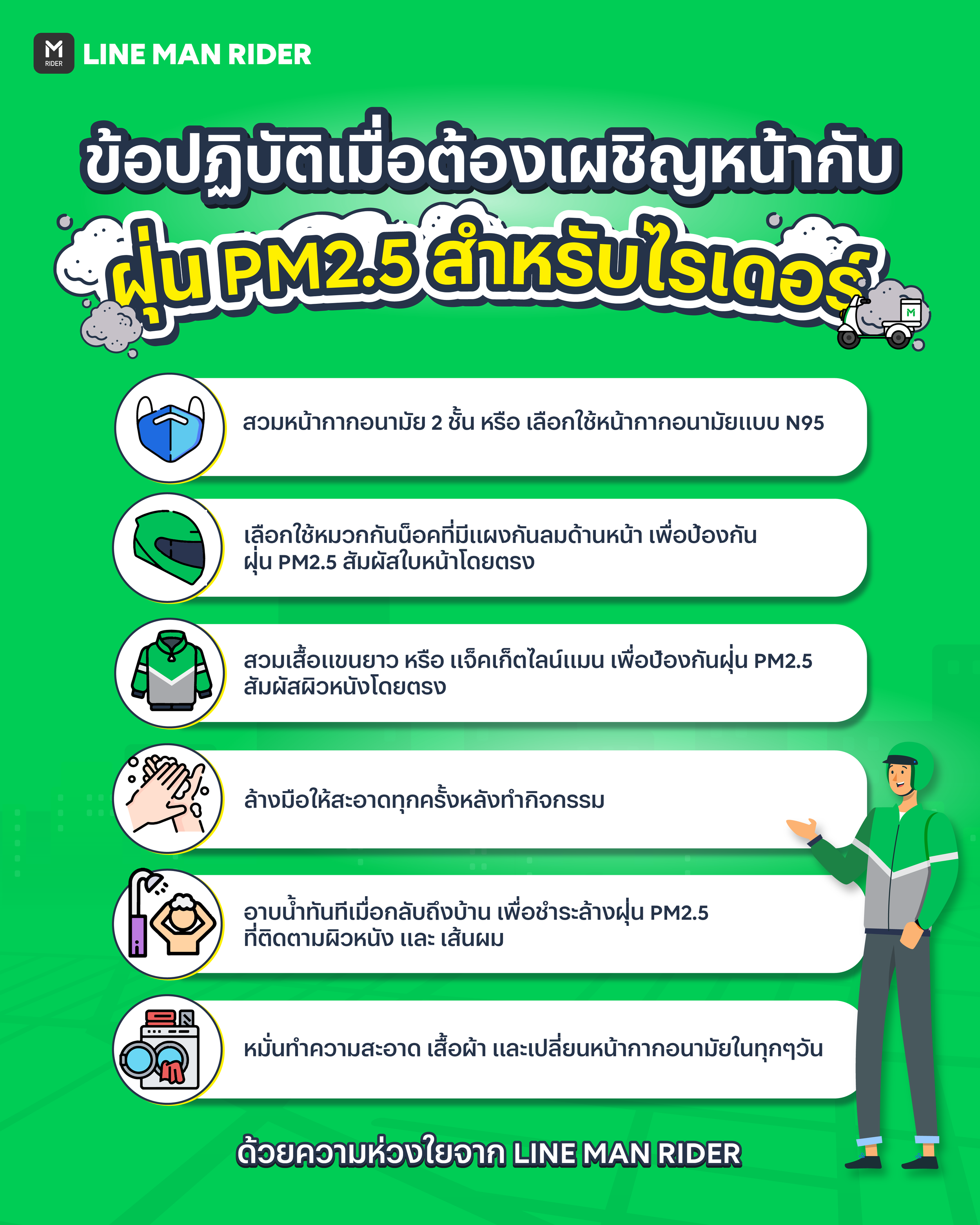 ปัจจุบันประเทศไทยกำลังเผชิญอยู่กับปัญหามลภาวะฝุ่น PM2.5 เกินค่ามาตรฐาน ที่ส่งผลต่อสุขภาพโดยตรง โดยเฉพาะกลุ่มเสี่ยงที่จะต้องปฏิบัติหน้าที่อยู่กลางแจ้งที่จะต้องระมัดระวังเป็นพิเศษ ซึ่งรวมถึงไรเดอร์ที่ปฏิบัติหน้าที่ในการเป็นฮีโร่ส่งต่อความอิ่ม และรอยยิ้มให้กับผู้ใช้บริการ