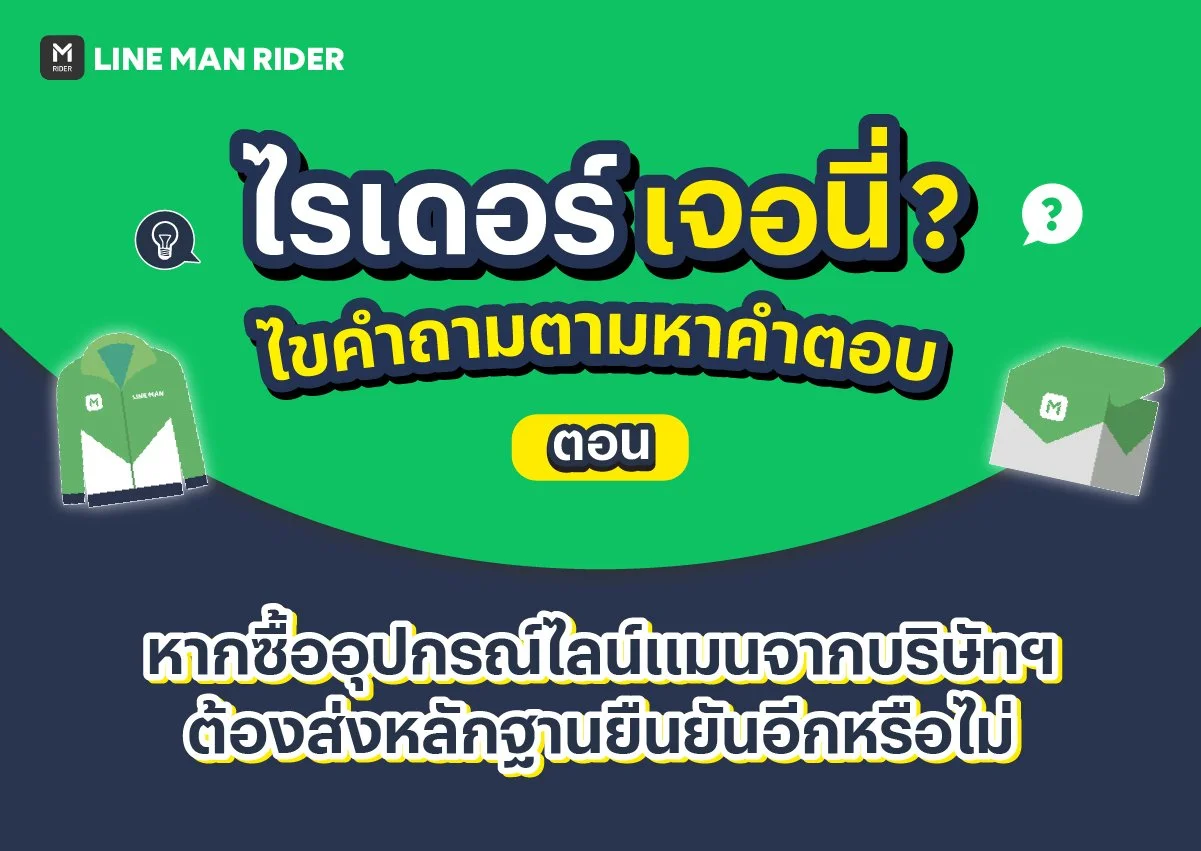 💡 คำตอบ : เมื่อไรเดอร์ซื้ออุปกรณ์ไลน์แมนผ่าน LINE MAN Shop หลังจากได้รับสินค้าภายใน 7 วันทำการ ไรเดอร์สามารถตรวจสอบสถานะการมีอุปกรณ์ไลน์แมนผ่านทางแอปพลิเคชัน หากตรวจสอบแล้วไม่พบเครื่องหมายยืนยันการมีอุปกรณ์ สามารถยื่นเรื่องยืนยันการมีอุปกรณ์ไลน์แมนบนแอปฯ LINE MAN RIDER หรือลิงก์ในแคปชัน