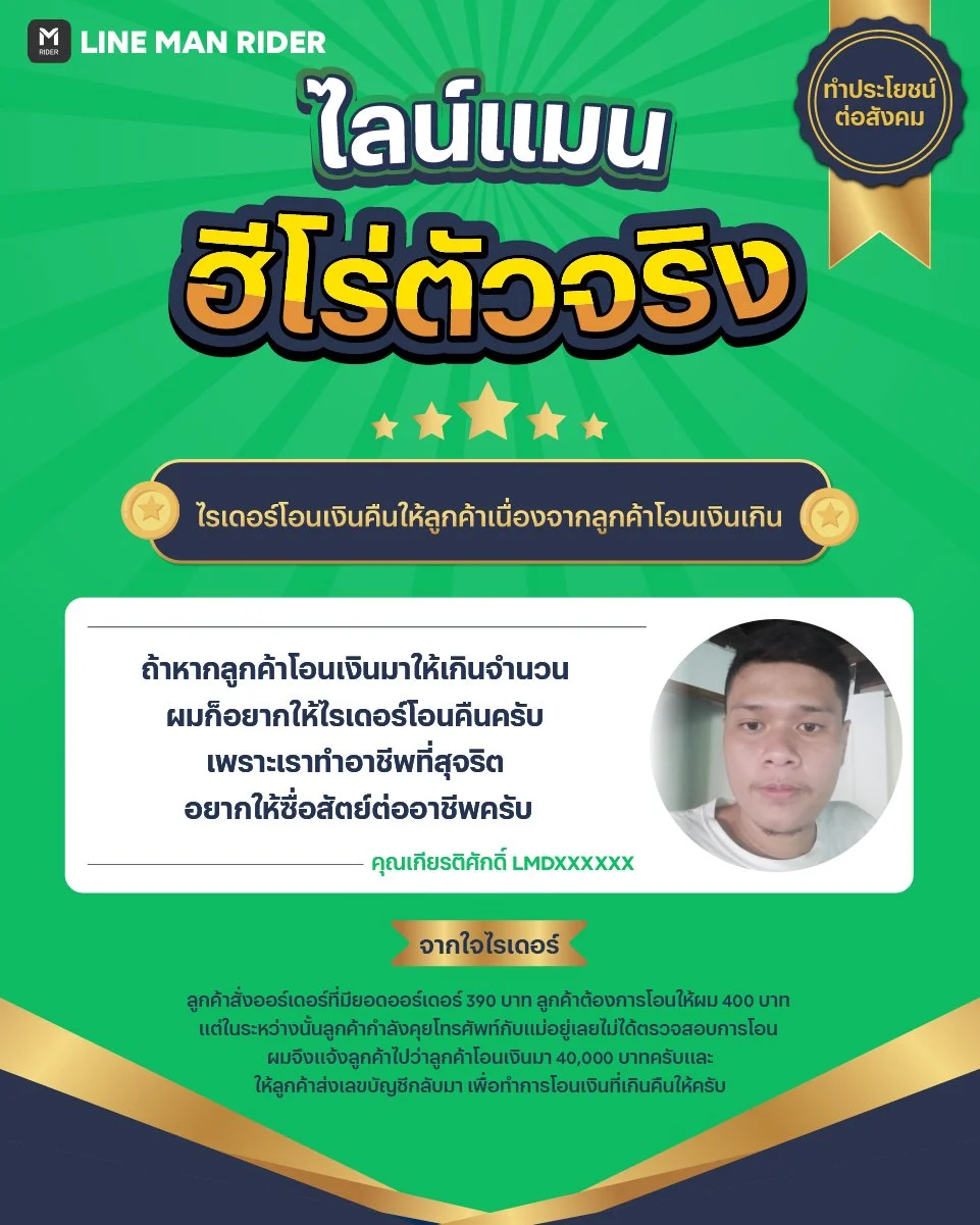📝 จากใจไรเดอร์ : ถ้าหากลูกค้าโอนเงินมาให้เกินจำนวน ผมก็อยากให้ไรเดอร์โอนคืนครับ เพราะเราทำอาชีพที่สุจริต อยากให้ซื่อสัตย์ต่ออาชีพครับ
