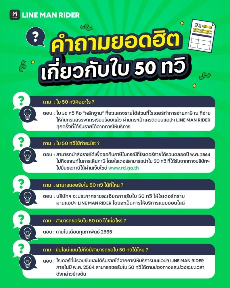 ไรเดอร์ที่มีรอบขับและได้รับรายได้จากการให้บริการบนแอปฯ LINE MAN RIDER ภายในปี พ.ศ. 2564 สามารถขอรับใบ 50 ทวิได้ตามช่องทางและช่วงระยะเวลาดังกล่าวข้างต้น