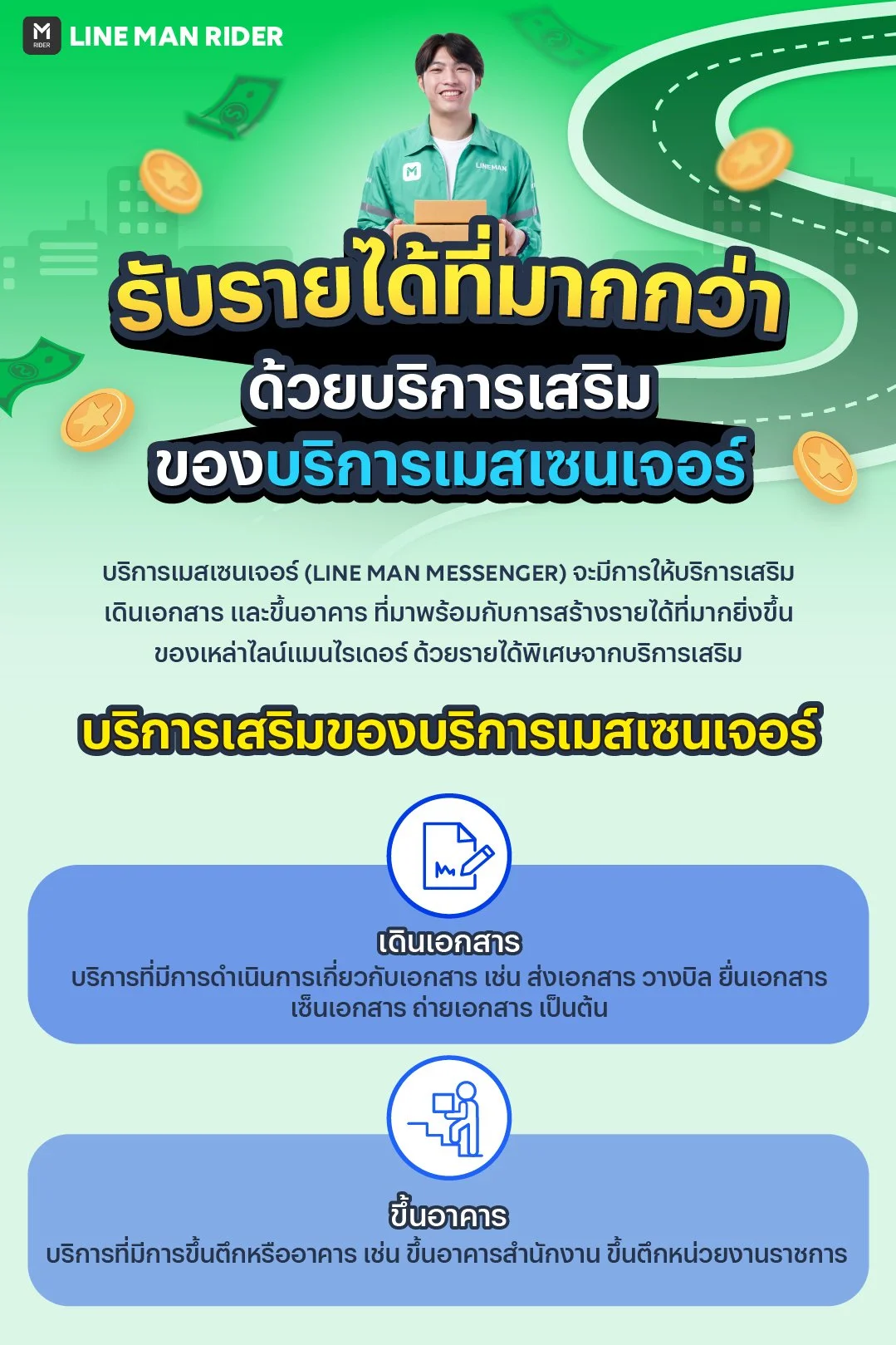 รับรายได้มากกว่า ด้วยบริการเสริมของบริการเมสเซนเจอร์ (LINE MAN MESSENGER) May 30 Written By Pitchayarach Ketrathon *เงื่อนไขเป็นไปตามที่บริษัทฯกำหนด Pitchayarach Ketrathon