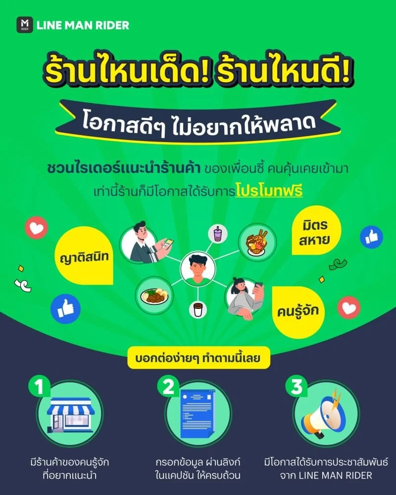 ร่วมเฟ้นหาร้านเด็ดสุดประทับใจ ร้านโดนใจที่ไลน์แมนต้องโปรโมทเป็นสุดยอดร้านแห่งปี จะร้านกาแฟ หรือข้าวกะเพรา เชิญเหล่าไลน์แมนไรเดอร์ร่วมลงชื่อได้ที่นี่เลย !