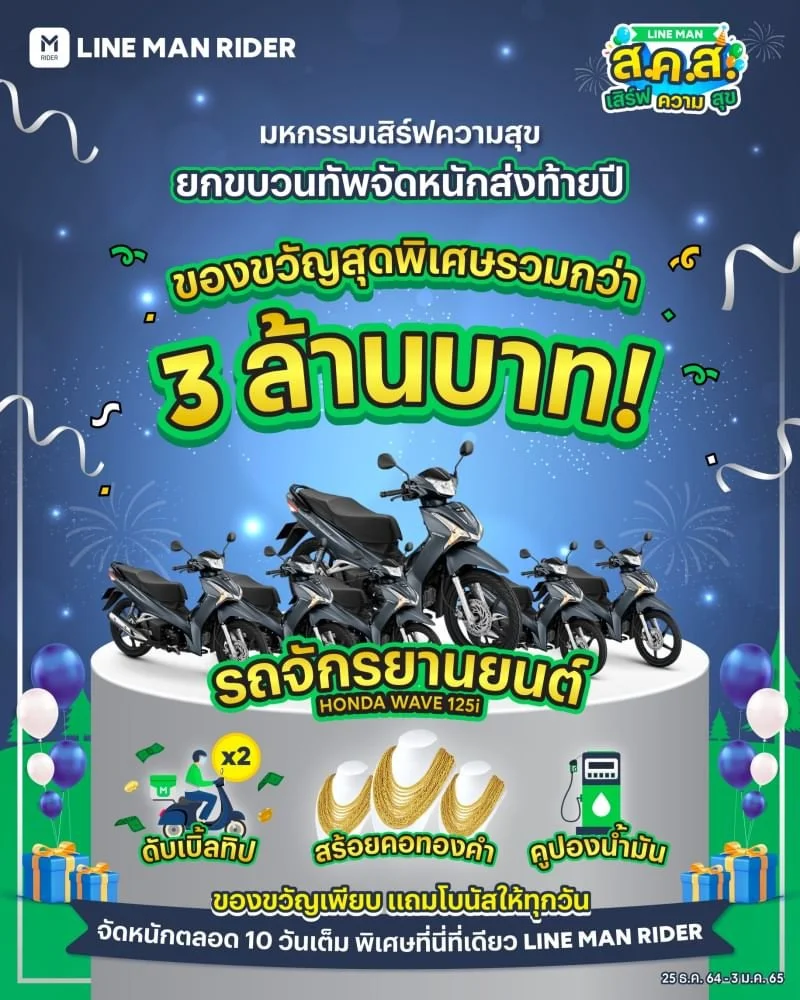 ★ ดับเบิ้ลทิป : ทุกทิปที่ไรเดอร์ได้รับจากลูกค้า LINE MAN สมทบเพิ่มอีกเท่าตัวเพื่อมอบเป็นของขวัญปีใหม่ให้แก่ไรเดอร์ทั่วประเทศ